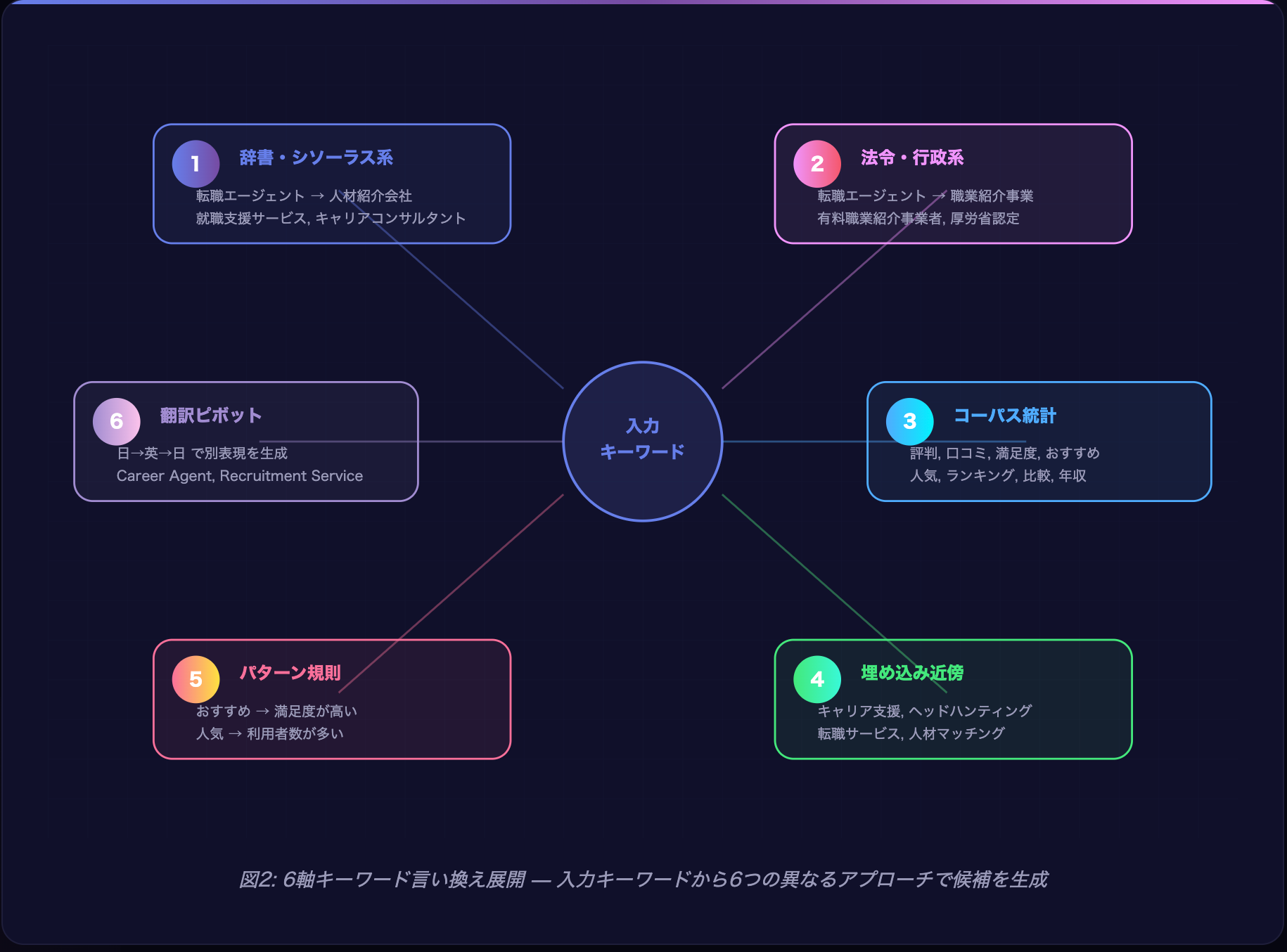 AIは、入力されたキーワードに対して以下の6つの異なる軸で言い換えを展開する。これは単純なシソーラス(類義語辞書)の参照にとどまらず、法令用語への変換、統計的共起分析、ベクトル空間上の近傍探索、規則ベースの変換、さらには多言語ピボットまで含む包括的な展開プロセスである。